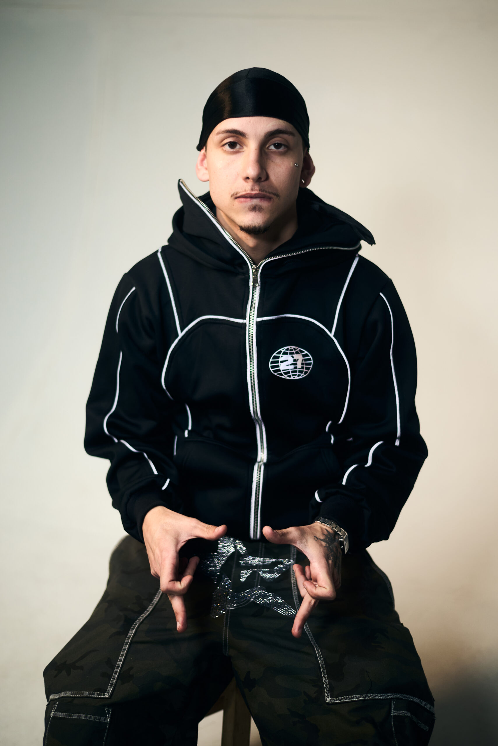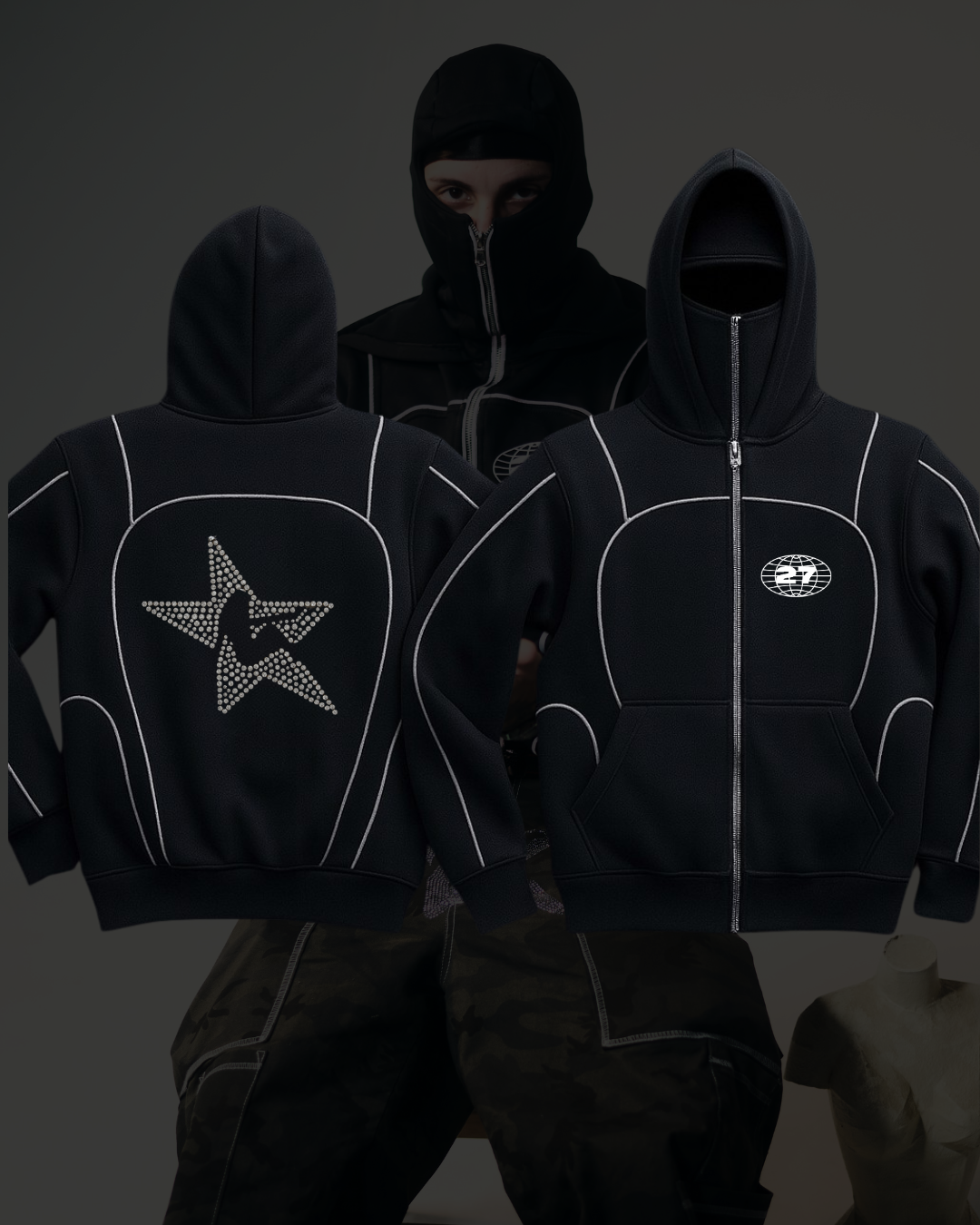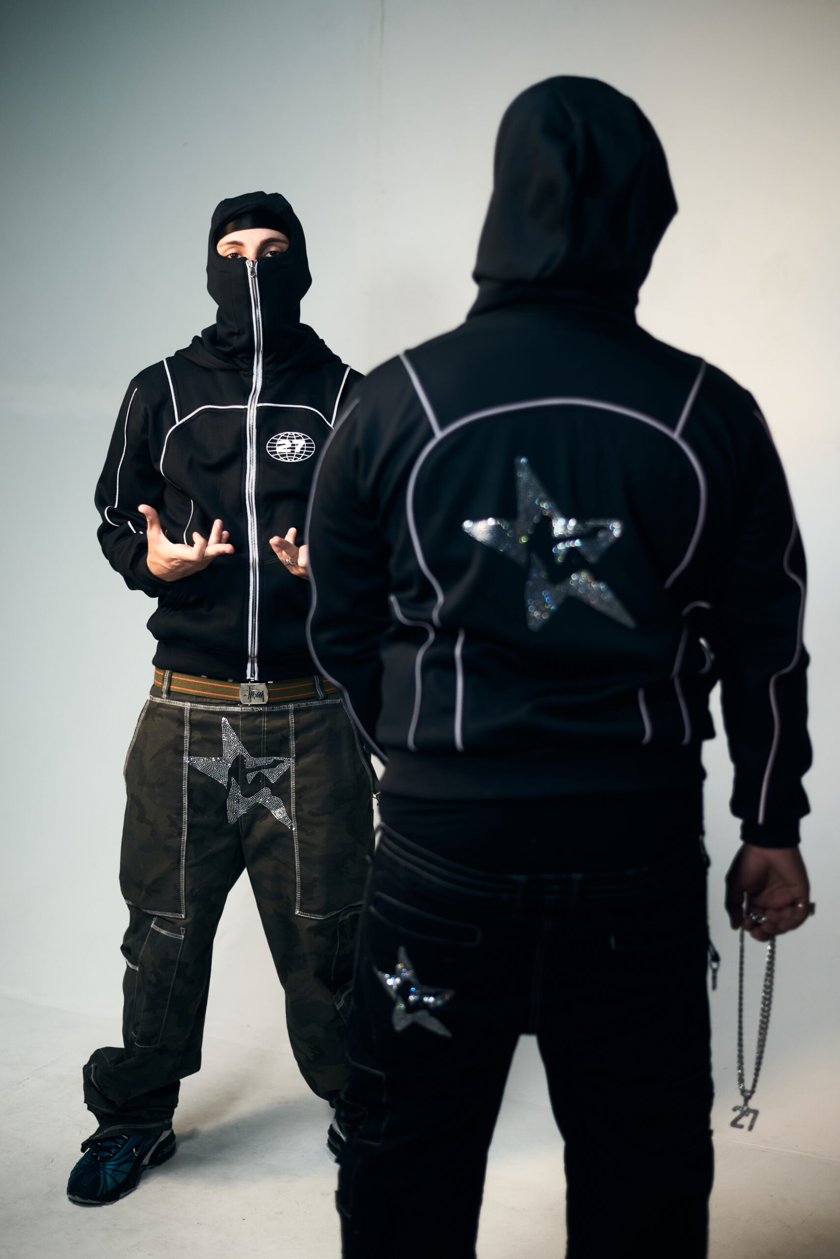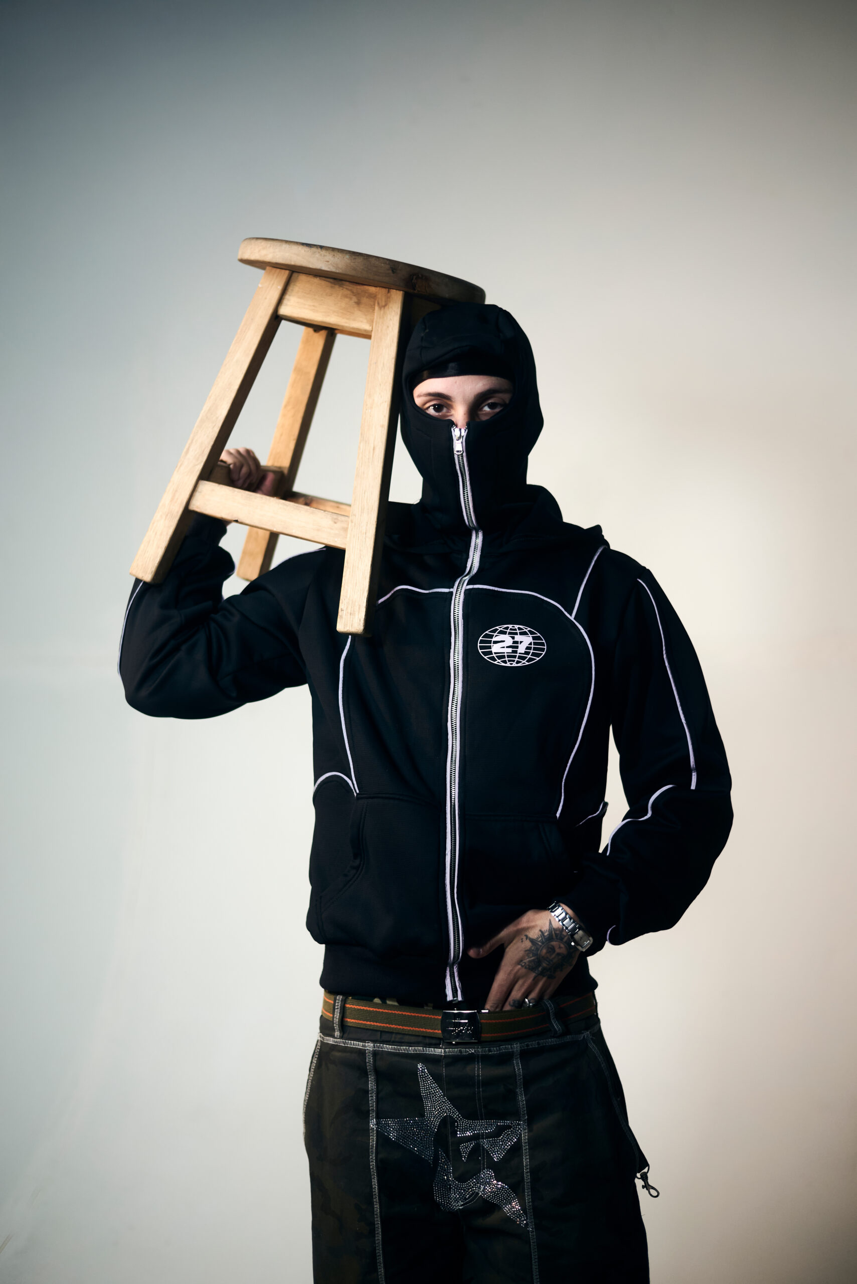 Su doble capucha, una de ellas ninja convertible en pasamontañas, redefine el concepto de estilo y funcionalidad.